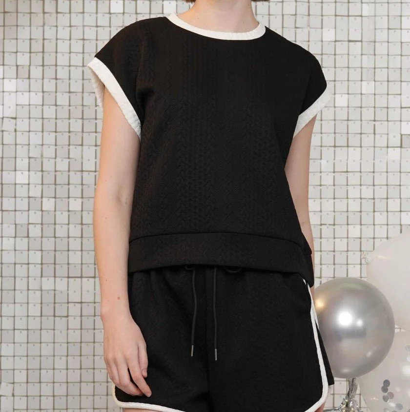 Black or Gray Knit Top with white contrast trim. Pair with Bianca knit shorts. 74% Polyester, 23% Rayon, 3% Spandex. Hand Wash.